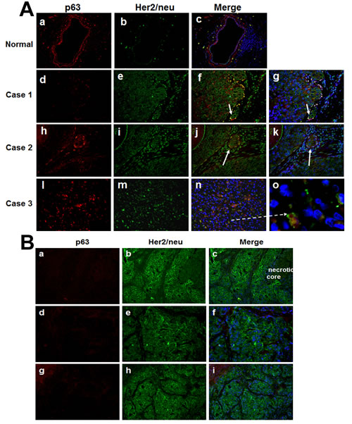 Figure 4: Immunofluorescence analysis of p63 and Her2/neu in clinical comedo-DCIS (A) and SUM-225 xenografts (B). A. Panels a-c, staining in normal ducts; panels d-o, clinical cases of comedo-DCIS. Arrows show microinvasive cancer cells with p63 and Her2/neu expression. Panel o is a magnified image of panel n (dashed arrow), and shows p63/Her2/neu coexpressing infiltrating tumor cells. B. a-c, early SUM225 lesions resembling comedo-DCIS; d-f and g-i, ductal infiltrating carcinomas in advanced SUM225 tumors. Note strong Her2/neu staining and absence of p63 expression in SUM225 tumors; the results are representative of five independent experiments. Magnifications X400 (panel o in A), all others X20.