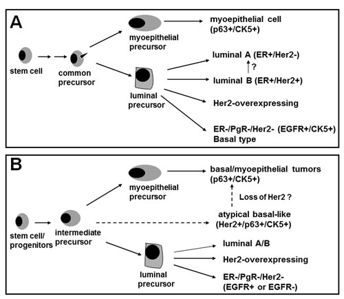 Figure 6: A novel model for emergence of basal-like breast cancer and breast cancer heterogeneity. Model A, the documented model for emergence of the known subtypes of breast cancer. Model B shows the identification of a novel subgroup that expresses p63, CK5 and Her2/neu while lacking EGFR expression. Our data suggest that comedo-DCIS contains this novel subgroup that serve as precursors for basal-like breast cancers. The p63/Her2/neu coexpressing tumor cells detected in comedo-DCIS could either give rise to p63+/Her2- tumors (typical basal-like triple negative cancer) or p63+/Her2+ tumors (atypical basal-like cancer). P63/Her2 coexpressing cancer cells probably represent an intermediate or transitional progeny and its accumulation suggest a potential block in the differentiation process.