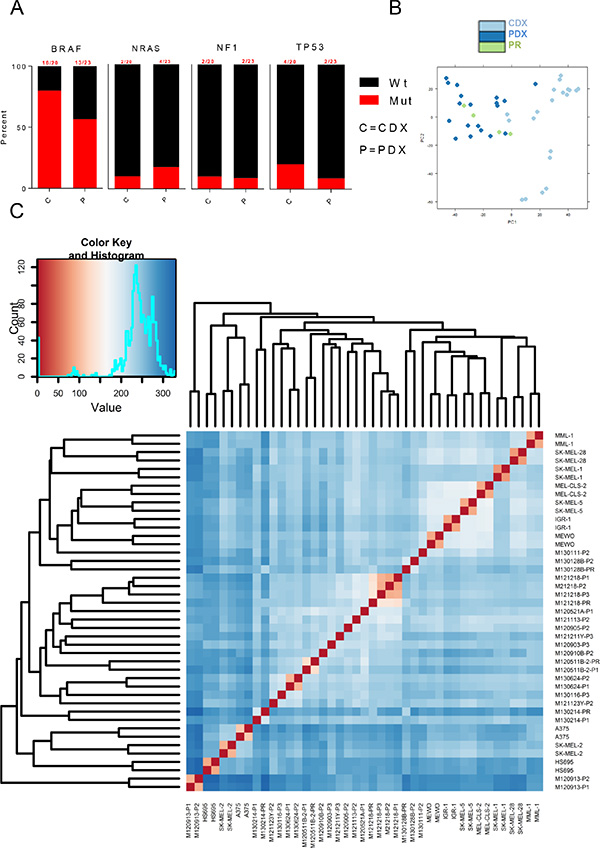 Figure 1: Transcriptome-wide differences between CDXs and PDXs. (A) Bar graphs showing commonly mutated genes in melanomas across PDXs and CDXs. (B) PCA plot of PDXs and CDXs. (C) Sample distance matrix of all samples used in the study.