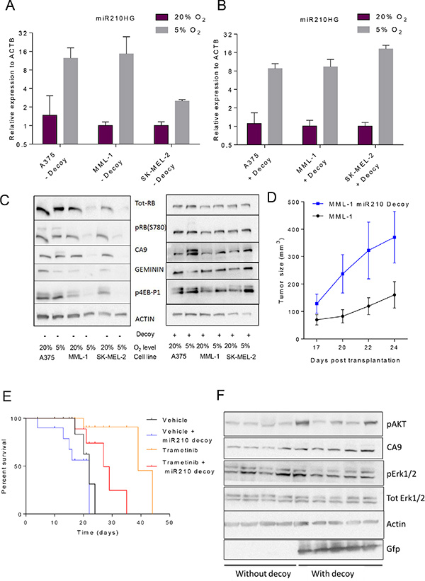 Figure 3: Abrogation of hsa-miR-210 regulation with miRNA decoys completely reverses hypoxia-induced protein translation in vitro and makes MML-1 cells less sensitive to MEK inhibition (GSK1120212/trametinib) in vivo by accelerating tumor progression. (A) qRT-PCR analysis shows marked induction of hsa-miR-210HG expression across the three cell lines in response to hypoxia. (B) qRT-PCR analysis showing hsa-miR-210HG induction in response to hypoxia across three cell lines engineered with the hsa-miR-210 decoy. (C) Western blot analysis of the original and miR210 decoy engineered cell lines under normoxic and hypoxic conditions after 24 h. (D) Tumor sizes post transplantation. (E) Kaplan-Meier plot showing survival statistics of mice carrying MML-1 wild type or decoy-engineered cells treated with either trametinib or vehicle food. (F) Western blot analysis of protein extracts from tumor pieces from MML-1 wildtype or decoy-engineered cells treated with vehicle food only.