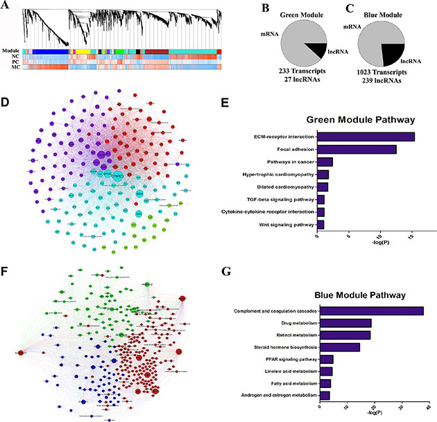 Figure 3: Network analysis of coding and long non-coding gene expression in CRC. (A) Relationships between network modules and traits. Upper panel, dendrograms produced by average linkage hierarchical clustering of genes on the basis of topological overlap. Modules of co-expressed genes were assigned colors as indicated by the horizontal bar beneath each dendrogram. Modules from different networks with significant overlap (corrected hypergeometric P < 0.05) were assigned the same color. Lower leaves indicate greater similarity of transcript expression profiles within that module. Lower panel (three correlation bands), NC, PC and MC bands show correlations (cor.) to the corresponding modules. Positive (red) and negative (blue). (B–C) Pie charts indicating the abundance of lncRNAs within green and blue modules. Module members are defined as all transcripts that were positively correlated with the module eigengene. (D) The co-expression network of green module. (E) KEGG pathway enrichment annotations of green module. (F) The co-expression network of blue module. (G) KEGG pathway enrichment annotations of blue module.