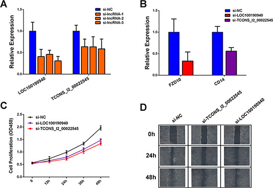 Figure 6: Functional analysis of candidate dysregulated lncRNAs. (A) Relative expression of LOC100190940 and TCONS_l2_00022545 measured by qPCR in HCT-116 cells transfected with siRNA. (B) Relative expression of FZD10 and CD14 measured by qPCR after in HCT-116 cells transfected with siRNA. (C) Growth curves illustrated the relative cell proliferation in HCT-116 cells transfected with LOC100190940 and TCONS_l2_00022545 siRNAs. (D) Wound healing scratch assay in HCT-116 cells transfected with LOC100190940 and TCONS_l2_00022545 siRNAs.