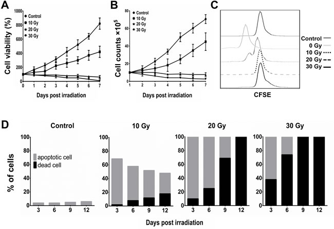 Figure 3: Inhibition of proliferation and induction of apoptosis of BA15 by γ-ray irradiation. After different dosages of irradiation, the cell viability and proliferation of BA15 cells were analyzed by MTT, cell counting, and CFSE assays. Apoptosis assays were performed every 3 days after irradiation. A. MTT assay indicated that the cell viability of BA15 cells decreased after exposure to 20 Gy and 30 Gy of irradiation. B. Cell counting indicated that the number of BA15 cells decreased after exposure to 20 Gy and 30 Gy of irradiation. C. CFSE labeling revealed that the proliferation of BA15 cells was completely inhibited after exposure to irradiation of 20 Gy and 30 Gy. D. The apoptosis assay revealed that all the cells in the 20-Gy and 30-Gy group were in apoptosis or dead 3 days after irradiation and that all the cells had died by day 12. There were fewer dead cells in the 20-Gy group than in the 30-Gy group at every time point. Error bars indicate standard deviations.