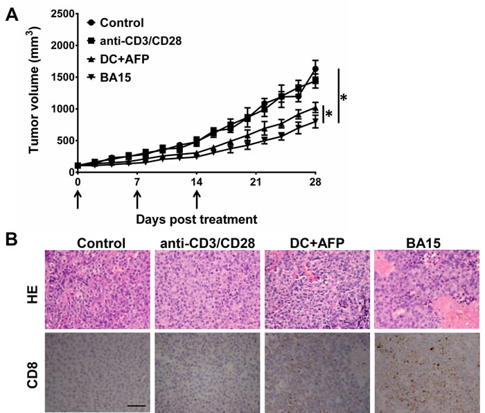 Figure 5: Suppression of tumor growth in vivo by AFP158-166-specific CTLs generated by BA15 cells. HepG2 cells were used to establish xenograft tumors in NOD /SCID mice. Nonspecific activated CTLs, DCs, or BA15-induced AFP-specific CTLs (1 × 108 in 0.2 mL PBS) were transferred into mice of different groups via intravenous injection at days 0, 7, and 14. Black arrows indicate the treatment times. PBS-treated mice were used as a control group. A. Treatment with AFP-specific CTLs expanded by DCs and BA15 displayed significantly higher tumor-suppressive functions than treatment with nonspecific activated CTLs or PBS. CTLs expanded by BA15 were the most efficient of these groups. B. HE staining showed that there were significantly more tumor cells exhibiting morphological changes indicative of apoptosis and necrosis in the BA15 group than others. The infiltration of CD8+ CTLs in the BA15 group was also significantly higher than that in other groups (P < 0.01). Scale bar = 100 μm; magnification, 400 ×. Error bars indicate standard deviations. * indicates P < 0.05.