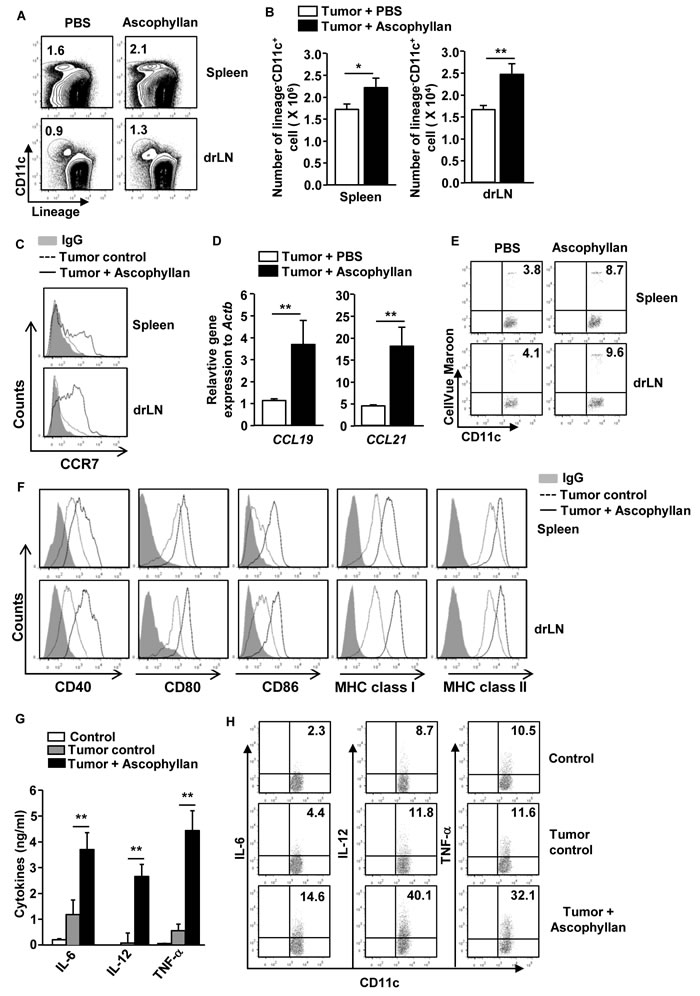 Figure 1: In vivo administration of ascophyllan induces maturation of DCs in the tumor-bearing mice. C57BL/6 mice were injected subcutaneously (s.c.) with 1 X 106 B16 melanoma cells. On day 10 after tumor cell injection, once tumors were well established, the mice were treated with 50 mg/kg ascophyllan for 24 hours and spleen and tumor draining lymph node (drLN) were harvested. A. Percentages of lineage-CD11c+ DCs in spleen and tumor drLN were analyzed on a flow cytometry. Lineage markers included CD3, Thy1.1, B220, Gr-1, CD49b and TER-119. B. Mean of absolute numbers of lineage-CD11c+ cells within live cells in spleen (left panel) and tumor drLN (right panel) are shown. C. Expression levels of CCR7 in gated lineage-CD11c+ cells from spleen and tumor drLN. D. Real-time PCR analysis of gene expression, presented relative to that of β-actin, in splenocytes. E. Isolated DCs from naïve mice were labeled with CellVeu Maroon and transferred into tumor-bearing mice. One hour after the DC transfer, the mice were treated with ascophyllan for 24 hours. Migration of CellVeu Maroon-labeled DCs was determined by flow cytometry. F. Flow cytometric analysis of co-stimulatory molecules and MHC class I and II in gated lineage-CD11c+ cells from spleen and tumor drLN. G. IL-6, IL-12p70 and TNF-α levels in sera are shown. H. Intracellular IL-6, IL-12 and TNF-α production in spleen DCs. All data are representative of or the average of analyses of 6 independent samples (2 mice per experiment, total 3 independent experiments). *p < 0.05, **p < 0.01.