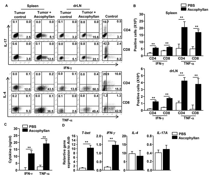 Figure 2: Ascophyllan promotes Th1 and Tc1 immune responses in the tumor-bearing mice. On day 10 after B16 cell injection, once tumors were well established, the mice were injected i.v. with 50 mg/kg ascophyllan and 3 days later, injected again with same amount of ascophyllan for further 3 days. A. Percentage of IFN-γ+, IL-17+, TNF-α+, and IL-4+ in CD4+ and CD8+ T cells within spleen and tumor drLN. Control plots show IL-4 and IL-17 staining from CD4 and CD8 T cells on in vitro stimulated splenocytes. B. Mean of absolute numbers of IFN-γ+ and TNF-α+ cells within live cells in spleen (upper panel) and tumor drLN (lower panel) are shown. C. IFN-γ and TNF-α levels in sera are shown. D. Real-time PCR analysis of gene expression, presented relative to that of β-actin, in splenocytes stimulated with ascophyllan for 24 hours. All data are representative of or the average of analyses of 6 independent samples (2 mice per experiment, total 3 independent experiments). **p < 0.01.