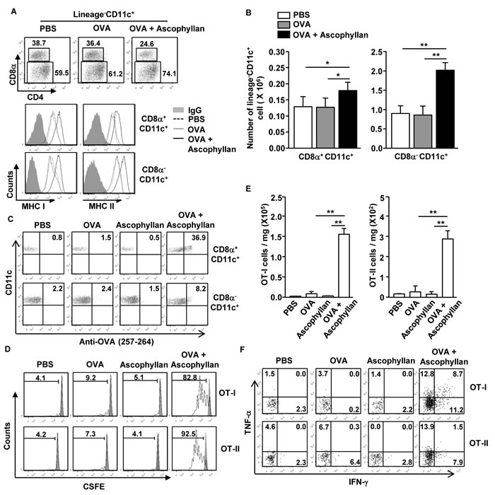 Figure 3: Ascophyllan promotes Ag-specific CD4 and CD8 T cell proliferation in the tumor-bearing mice. B16 tumor-bearing C57BL/6 mice were injected with PBS, OVA or combination of ascophyllan and OVA for 24 hours. A. Percentage of lineage−CD11c+CD8α+ and lineage−CD11c+CD8α− cDCs in spleen was analyzed on a flow cytometry (upper panel). Expression levels of MHC class I and II in the CD11c+CD8α+ and CD11c+CD8α− cDCs are shown (lower panel). B. Mean of absolute number of CD11c+CD8α+ and CD11c+CD8α− cDCs within live cells in spleen. C. Presentation of OVA peptide in the CD11c+CD8α+ and CD11c+CD8α− cDCs was analyzed by Flow cytometry. D. Purified CD8 T cells from OT-I or CD4 T cells from OT-II mice were labeled with CFSE and transferred into B16 tumor-bearing CD45.1 congenic mice, and 24 hours later, mice were injected with PBS, OVA or combination of ascophyllan and OVA. On day 3 after ascophyllan and OVA injection, splenocytes from these mice were stained for CD45.2 to identify the donor OT-I or OT-II cells, and the proliferation of these cells was determined by CFSE dilution. E. Mean of absolute numbers of OT-I (left panel) and OT-II (right panel) cells in the tumor are shown. F. Percentage of IFN-γ+ and TNF-α+ cells in tumor-infiltrated OT-I and OT-II cells. All data are representative of or the average of analyses of 6 independent samples (2 mice per experiment, total 3 independent experiments). **p < 0.01, *p < 0.05.