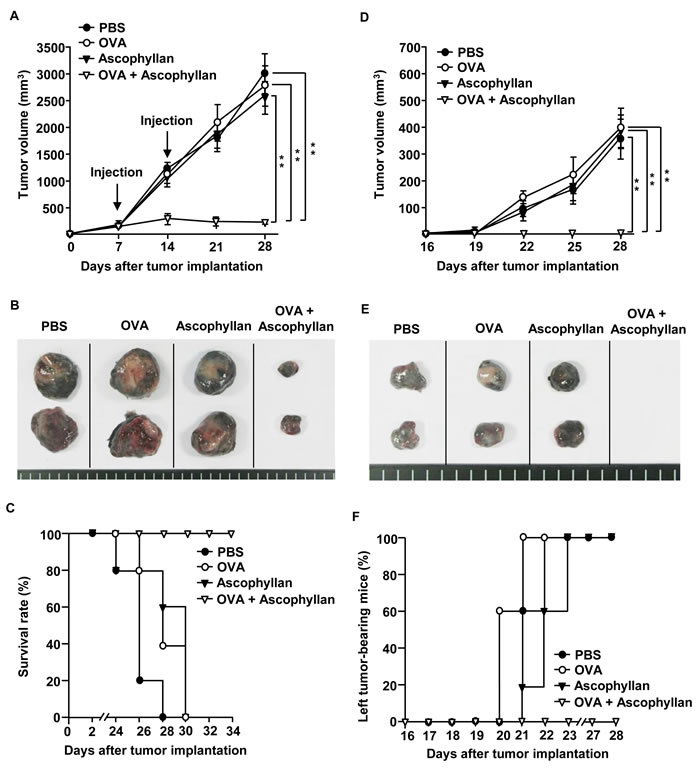 Figure 4: The combination treatment with ascophyllan and OVA inhibits B16-OVA tumor growth. C57BL/6 mice were injected s.c. with 1 X 106 B16-OVA cells on right side of mice. Once tumors were well established on day 7, mice received i.v. with PBS, OVA, ascophyllan or the combination of ascophyllan and OVA and 7 days later, treated with the same amount of OVA and ascophyllan again. A. B16-OVA tumor growth curves on right side of mice are shown. B. The size of tumor mass on day 28 after B16-OVA tumor cell challenge. C. Survival rate of mice is shown. D. On day 16 after B16-OVA cell challenge on right side, the mice were inoculated s.c. with 1 X 106 B16-OVA cells on left side. Tumor growth on left side of mice is shown. E. The size of tumor mass on left side on day 28 after the initial tumor cell challenge on right side. F. Percentage of tumor-bearing mice on left side is shown. All data are representative of or the average of analyses of 5 independent samples (2 or 3 mice per experiment, total 2 independent experiments). **, statistically significant values, defined as P < 0.01 and determined with paired Student’s t test, compared with corresponding groups.