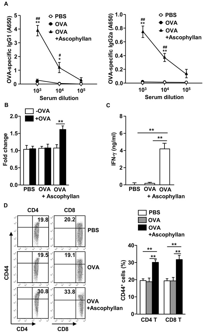 Figure 5: Ascophyllan provides an adjuvant effect on OVA-induced B and T cell responses. C57BL/6 mice were immunized i.v. with PBS, OVA or the combination of OVA and ascophyllan on day 0, 15 and 30. A. On day 35, serum OVA-specific IgG1 (left panel) and IgG2a (right panel) concentrations were measured by ELISA. *P < 0.05, **P < 0.01 versus OVA group. #P < 0.05, ##P < 0.01 versus PBS group. B. On day 35 after immunization, splenocytes were re-stimulated with or without OVA (50 μg/ml) for 4 days. Proliferation of splenocytes was measured. C. IFN-γ concentrations in the cultured supernatants of above splenocytes are shown. D. Expression of CD44 in CD4 or CD8 T cells was analyzed on a flow cytometry on day 35 (left panel). Mean percentages of CD44+ cells in CD4 or CD8 T cells are shown (right panel). All data are representative of 6 samples from 3 independent experiments. **p < 0.01.