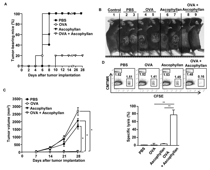 Figure 6: Immunization with ascophyllan and OVA protects mice from challenge with B16-OVA melanoma cells. C57BL/6 mice were immunized with PBS, OVA, ascophyllan or the combination of ascophyllan and OVA on day 0, 15 and 30. On day 35 after immunization, the mice were challenged s.c. with 1 X 106 B16-OVA melanoma cells. A. The percentages of tumor-bearing mice are shown. B. The pictures of tumor-bearing mice on day 28 are shown. C. Tumor growth curves are shown. All data are representative of or the average of analyses of 5 independent samples (2 or 3 mice per experiment, total 2 independent experiments). *, statistically significant values, defined as P < 0.01 and determined with paired Student’s t test, compared with corresponding groups. D. CTL activity was assessed in vivo at 35 days of immunization by adoptively transfer of splenocytes populations labeled with different concentrations of CFSE and loaded with SIINFEK, and also a control splenocyte population without peptide labeled with CMTMR. Dot plots show percentage of SIINFEK-loaded CFSE+ cells and non-peptide-loaded CMTMR+ cells (upper panel). Mean percentages of Ag-specific lysis (lower panel). Data are from analyses of 5 individual mice each group (2 or 3 mice per experiment, total 2 independent experiments). **p < 0.01.
