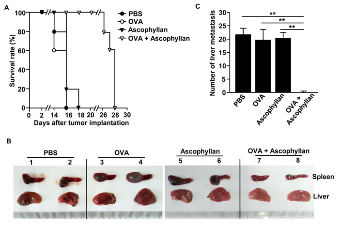 Figure 7: Treatment with ascophyllan and OVA prevents B16-OVA tumor cell metastasis into liver. C57BL/6 mice were treated i.v. with PBS, 50 μg OVA, 50 mg/kg ascophyllan or the combination of ascophyllan and OVA. On day 3 after the injection, the mice were inoculated intrasplenically (i.s.) with B16-OVA melanoma cells. On day 3 after B16-OVA cell challenge, mice received same amount of ascophyllan and OVA treatment again. A. Survival rates of mice are shown. B. The size of tumor mass in spleen and metastasis of B16-OVA cells into the liver on day 10 after tumor injection are shown. C. Mean of absolute number of B16-OVA metastasis into the liver. All data are representative of or the average of analyses of 5 independent samples (2 or 3 mice per experiment, total 2 independent experiments). **p < 0.01.