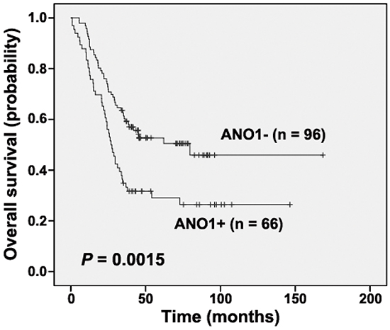 In the surgical specimens investigated, positive ANO1 staining was detected in 38.1% (109/286) of tumors from the first cohort, but in none of all the morphologically normal operative margin tissues (Supplementary Figure S1). ANO1 expression was seen in the cytoplasm and cell membrane of the tumor cells, and was significantly associated with the location of tumors (P = 0.0201, Supplementary Table S1). In the 286 tumors tested from the first cohort, the patient follow-up information of 162 cases was obtained, with an OS time of one to 168 months. Kaplan-Meier curves showed that patients with positive ANO1 expression had a shorter OS compared to those with undetectable expression (P= 0.0015, Figure 1). Univariate Cox proportional hazards regression analysis showed that lymph node metastasis, advanced tumor stages and ANO1 expression were significantly correlated with poorer OS (P = 0.0012, 0.0438 and 0.0018). Multiple Cox proportional hazards regression analysis indicated that lymph node metastasis and ANO1 expression were independent prognostic factors for ESCC patients (hazard ratio = 1.8234 and 1.9031, P = 0.0146 and 0.0020, Table 1).