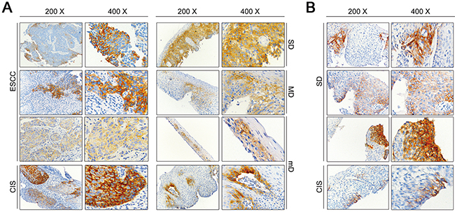 Figure 3. Representative immunohistochemical results of ANO1 positive staining. A. Positive immunohistochemical staining of ANO1 in precancerous lesions and ESCC tissues in the sample set between 2005 and 2007 (magnification 200× and 400×). B. Positive immunohistochemical staining of ANO1 in precancerous lesions in the sample set between 1996 and 2002 (magnification 200× and 400×). mD, mild dysplasia; MD, moderate dysplasia; SD, severe hyperplasia; CIS, carcinoma in situ; ESCC, esophageal squamous cell carcinoma.