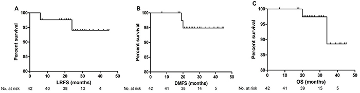 Of the 42 patients, 9.5% (4/42) and 4.8% (2/42) of patients had experienced progression or died at the last follow-up. The 2 patients died because of distant metastasis, other than treatment related toxicities. The response rates were as follows: 38 patient had a complete response (90.5%), 4 patients had a partial response (9.5%), and no patients had progressive disease, giving an objective response rate (ORR) of 100% (Table 2). The 2-year LRFS, DMFS and OS were 96.4%, 93.1% and 96.6% respectively (Figure 1).
