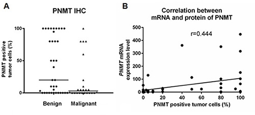 Figure 5: Comparison of benign and malignant PCC/PGL. Comparative quantification of PNMT protein levels by immunohistochemistry (IHC) (A) Correlation between PNMT mRNA and protein levels (B).