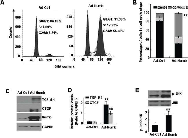 Figure 4: Ectopic expression of Numb causes proximal tubular cell arrest at G2/M in vitro. HK-2 cells were infected with Ad-Numb or empty vector (Ad-Ctrl). A. Cell cycle analysis by propidium iodide staining and flow cytometry in HK-2 cells. B. Bar graph depicted the percentage of cells in the different stages of the cell cycle. Symbols in the cell cycle data panels refer to the comparison of G2/M phases. C. Western blot analysis of the expression of Numb, TGF-β1, CTGF in Ad-Numb or Ad-Ctrl infected cells. GAPDH was used to verify equivalent loading. D. Graphic representation of relative abundance of TGF-β1 and CTGF to GAPDH. E. Western blot analysis of p-JNK in Ad-Numb or Ad-Ctrl infected cells (upper panel). Graphic representation of relative abundance of p-JNK to total JNK (lower panel). Data are expressed as mean±SD of three independent experiments. **p < 0.01 versus Ad-ctrl.