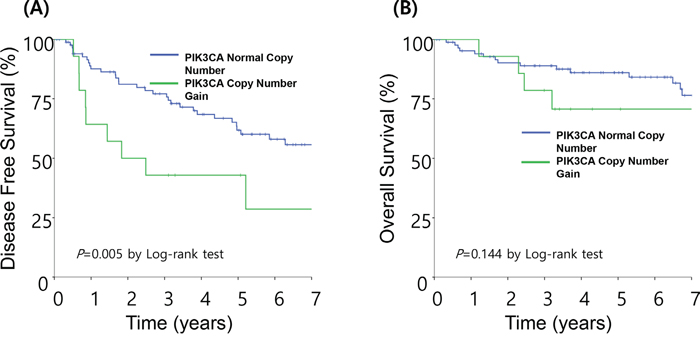 There were 82 cases with complete data on PIK3CA mutation and copy number status (Supplementary Table 2). Although not statistically significant, PIK3CA mutations were more frequent in the cases of copy number gain. Of the 7 tumors with PIK3CA mutation, 3 tumors (21.4%) exhibited copy number gain, whereas only 4 tumors (5.9%) had normal copy numbers.