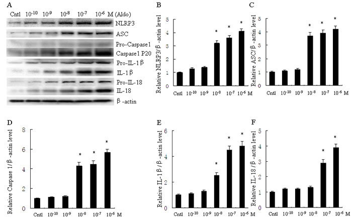 Figure 1: Aldo dose-dependent activated NLRP3 inflammasome in HK-2 cells. A. Western blot of NLRP3, ASC, activated caspase-1, IL-1β, and IL-18. HK-2 cells were treated with Aldo (ranging from 10-10-10-6 M) for 24 h. B.-F. densitometric analysis of protein expression of NLRP3 (B), ASC (C), active caspase-1 (D), IL-1β (E), and IL-18 (F). Data are expressed as mean ± SEM (n = 6). *, P < 0.01 vs. Cntl. Cntl: untreated control group.