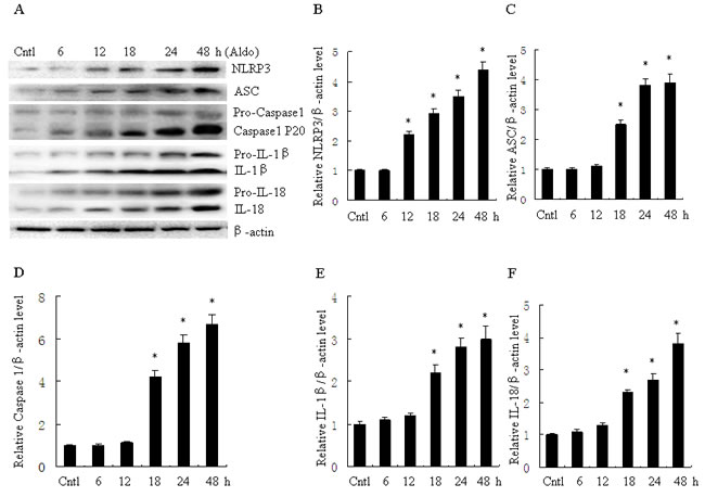 Figure 2: Aldo time-dependent activated NLRP3 inflammasome in HK-2 cells. A. Western blot of NLRP3, ASC, activate caspase-1, IL-1β, and IL-18. HK-2 cells were treated with Aldo (10-7 M) for 6-48 h. B.-F. densitometric analysis of NLRP3 (B), ASC (C), active caspase-1 (D), IL-1β (E), and IL-18 (F). Data are expressed as mean ± SEM (n = 6). *, P < 0.01 vs. Cntl. Cntl:untreated control group.