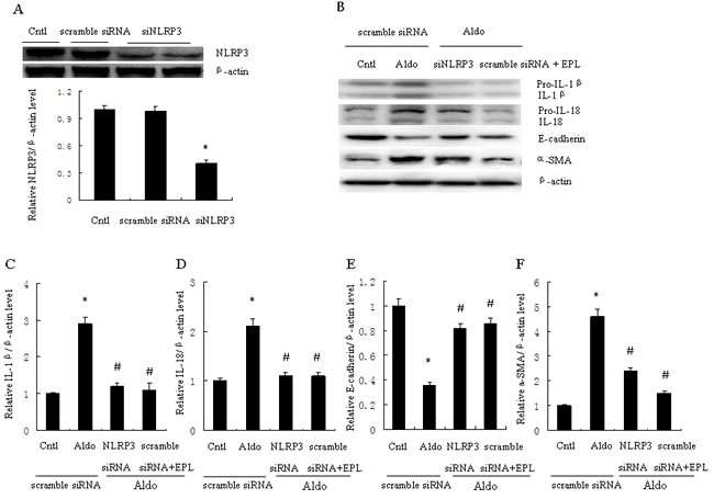 Figure 3: Transfection with siNLRP3 or treatment with EPL inhibits Aldo-induced NLRP3 inflammasome and phenotypic alternation in HK-2 cells. A. Western blot of NLRP3 protein expression. Cells were transfected with scramble siRNA or siNLRP3 (siRNA against NLRP3). B. Western blot of IL-1β, IL-18, E-cadherin, and α-SMA. HK-2 cells were transfected with 500 nM siNLRP3 or scramble siRNA for 24 h before treatment with Aldo (10-7 M). At the end of the incubation period, NLRP3 inflammasome activation and cell phenotypic alternation was evaluated. C.-F. densitometric analysis of IL-1β (C), IL-18 (D), E-cadherin (E) and α-SMA (F). Data are expressed as mean ± SEM (n = 6). *, P < 0.01 vs. Cntl+ scramble siRNA; #, P < 0.01 vs. Aldo+scramble siRNA group. Cntl: untreated control group.