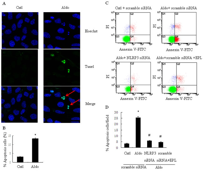 Figure 4: siNLRP3 and EPL inhibit Aldo-induced apoptosis in HK-2 cells. A. Representative images of Hoechst 33258 and TUNEL staining in control HK-2 cells or HK-2 cells treated with Aldo. Arrows indicate apoptotic cells. B. Quantitation of apoptosis. The cells were stained and determined by flow cytometry. C. HK-2 cells were transfected with 500 nM siNLRP3 or scramble siRNA for 24 h before treatment with Aldo (10-7 M). D. HK-2 cell apoptosis was measured by flow cytometry. At the end of the incubation period, apoptosis was evaluated in the cells. Data are expressed as mean ± SEM (n = 6). *, P < 0.01 vs. Cntl; #,P < 0.01 vs. Aldo+scramble siRNA group. Cntl: untreated control group.
