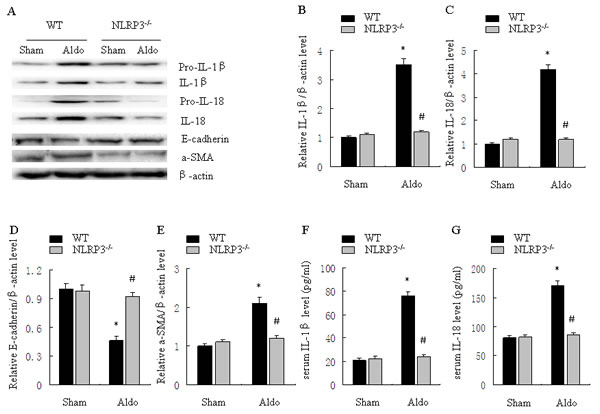 Figure 6: Knockout of NLRP3 ameliorates Aldo-induced activation of the NLRP3 inflammasome and phenotypic alternation in mice treated with Aldo-infusion. A. Western blot of IL-1β, IL-18, E-cadherin, and α-SMA. B.-E. Densitometric analysis of IL-1β (B), IL-18 (C), E-cadherin (D), and α-SMA (E) expression. F., G. ELISA analysis of serum IL-1β (F) and IL-18 (G) concentration. Data are expressed as mean ± SEM (n = 6). *, P < 0.01 vs. WT/Sham group; # , P < 0.01 vs. WT/Aldo group.