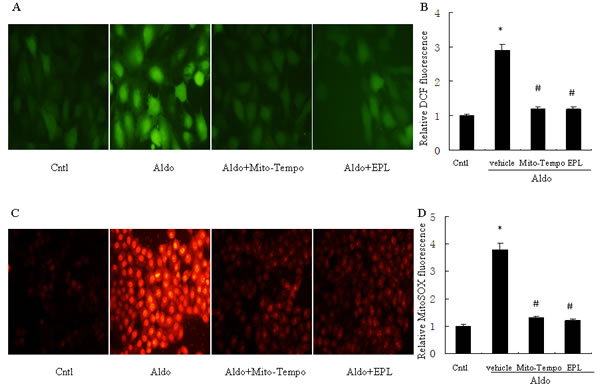 Figure 7: Treatment with Mito-Tempo or EPL prevents Aldo-induced mitochondrial ROS production. For detection of ROS, HK-2 cells were seeded into six well plates, and allowed to grow until they reached confluent cell density, they were washed twice with PBS and incubated with DCFDA (10 µM) or MitoSOX (5 µM ) for 30 min, then treated with Aldo (10-7 M) in the presence of Mito-Tempo (10 µM), EPL (10 µM), or vehicle. A. Representative images of HK-2 cells stained with dichlorodihydrofluorescein diacetate. B. Quantification of 2’,7’-dichlorofluorescein (DCF) fluorescence. C. Representative images of HK-2 cells stained with MitoSOX. D. Quantification of MitoSOX fluorescence. Data are expressed as mean ± SEM (n = 6). *, P < 0.01 vs. Cntl ; #, P < 0.01 vs. Aldo-treated group.