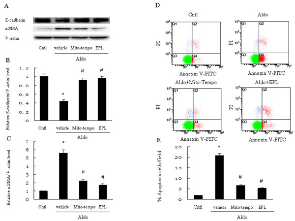 Figure 8: Treatment with Mito-Tempo or EPL inhibits Aldo-induced cell phenotypic alternation and apoptosis in HK-2 cells. HK-2 cells were pretreated with Mito-Tempo (10 µM) or EPL (10 µM) for 30 min, followed by incubation with Aldo (10-7 M) for 48 h. A. Western blot of E-cadherin and α-SMA. B., C. Densitometric analysis of E-cadherin (B) and α-SMA(C). D., E. HK-2 cell apoptosis measured by flow cytometry. Cells were pretreated with Mito-tempo (10 µM) and EPL (10 µM) for 30min, followed by incubation with Aldo (10-7 M) for 24 h. Data are expressed as mean ± SEM (n = 6). *, P < 0.01 vs. Cntl; # , P < 0.01 vs. Aldo-treated group.