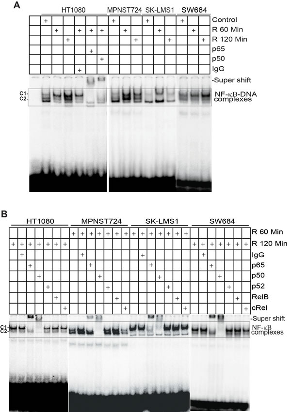 All four human STS cells exhibit weak constitutive NF-κB activity (Figure 6A). However, radiation induces rapid NF-κB activation in all four cell lines within 60 minutes post radiation (Figure 6A). NF-κB subunit-specific antibody-based supershift assays indicate that no p52, RelB, or cRel DNA-binding activity was detectable in irradiated human sarcoma cells (Figure 6B). Two types of NF-κB-DNA complexes were detected. The C1 complex represents the canonical NF-κB p65/p50 heterodimer, whereas the C2 complex represents the NF-κB p50/p50 homodimer (Figure 6B). Therefore, we have determined that radiation activates both the canonical NF-κB p65/p50 heterodimer and the NF-κB p50/p50 homodimer.