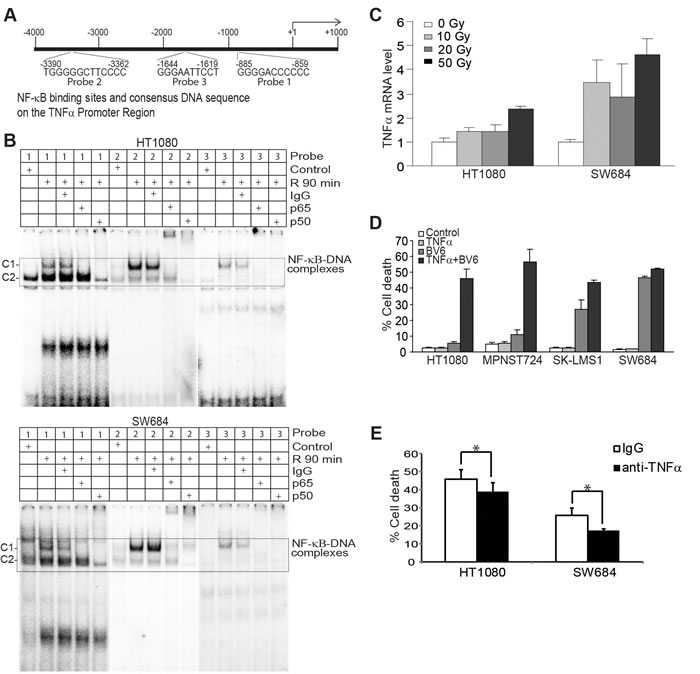 Figure 7: Radiation-induced NF-κB directly regulates TNFα transcription that acts in concert with BV6 to induce tumor cell death. A. The human TNFα promoter structure. The three NF-κB-binding consensus sequence elements are indicated at the bottom of the bar. B. Tumor cells were irradiated at a dose of 50 Gy and then cultured for 90 min. Nuclear extracts were prepared and analyzed for NF-κB activation using EMSA with the three DNA probes of the human TNFα promoter as indicated in A. C. Tumor cells were irradiated with the indicated dose and cultured for 24h. Cells were then analyzed for human TNFα mRNA level using quantitative PCR. D. Tumor cells were treated as indicated for 24h and analyzed for cell death using PI staining and flow cytometry analysis. E. Tumor cells were irradiated and then cultured in the presence of BV6 (5 µM). IgG or anti-TNFα neutralization antibody (200 µg/ml) was added to the culture, respectively, for 24h. Cell death was analyzed by PI staining and flow cytometry analysis. *p < 0.05.