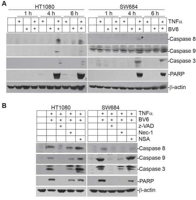 Figure 10: TNFα and BV6 cooperate to activate sequential necroptosis and apoptosis. A. Tumor cells were cultured in the presence of TNFα (100 U/ml), BV6 (5 µM), or both for the indicated time and analyzed by Western blotting analysis for the indicated caspases. PARP was used as an apoptosis indicator. B. Tumor cells were cultured in the presence of TNFα (100 U/ml), BV6 (5 µM), plus Z-VAD (10 µM), Nec-1 (10 µM), or NSA (2 µM), respectively for 4 h, and analyzed by Western blotting for the indicated caspases and PARP.