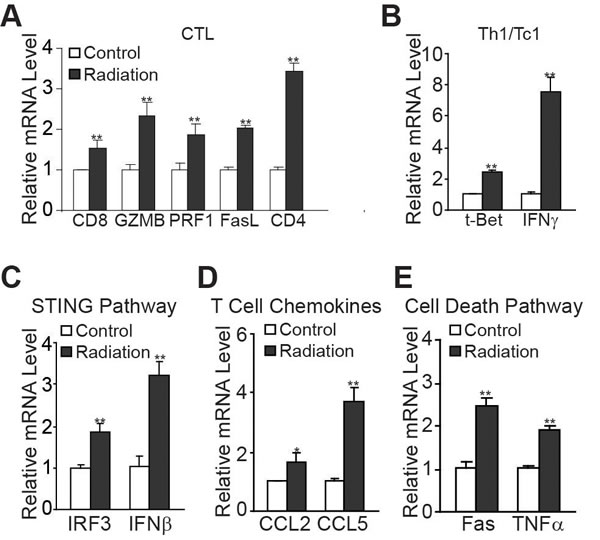 Figure 12: Radiation induces T cell immune responses in the tumor microenvironment. Tumors of CMS4-met tumor-bearing mice were irradiated at a dose of 20Gy as shown in Figure 11E. Tumors were excised 8 days after radiation and RNA was isolated from the tumor tissues of untreated control and irradiated mice and analyzed by quantitative PCR for signature genes of T cells (A.), Th1/Tc1 T cells (B.), the STING pathway (C.), T cell chemokines (D.), and TNF cell death pathways (E.). RNA from tumor tissues of three irradiated mice was pooled and RNA from tumor tissues of three untreated mice was pooled and used to prepare cDNA. The expression levels of genes in the control group were arbitrarily set to 1 for each subset of genes. The expression level of genes in the irradiated group is expressed as fold change over the control. *p<0.05, **p<0.01.