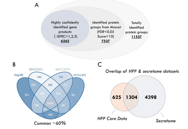 Combining the raw data from 144 MS runs (4 cell lines, 12 fractions for each, 3 biological replicates), a total of 11,537 proteins (q<0.05 from PD software) were identified. Applying stepwise stringent quality control strategies, over 6500 proteins (representing 6242 GPs) were identified (Figure 2A) (Supplemental Table S1), 3454 GPs of which (~60%) were common among the HCC cell lines (Figure 2B). Matching our secretome dataset to the core human plasma database, which contains 1929 proteins [41], revealed that almost 70% (1304 GPs) of the proteins were covered by the HCC secretome (Figure 2C).