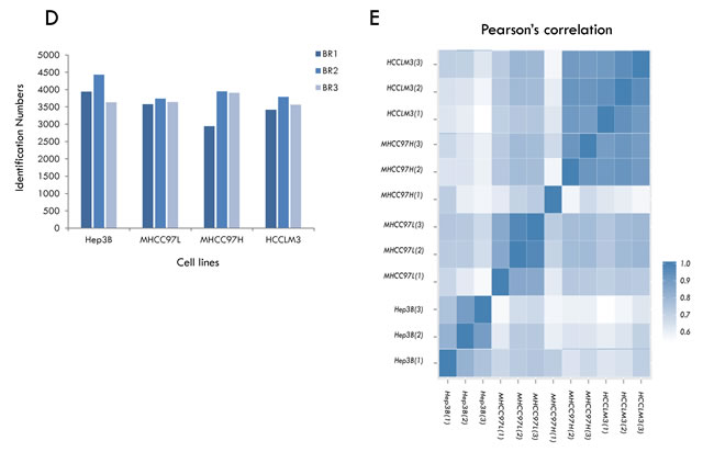 Figure 2: Summary of identification and quantitative analysis of the secretome. A. The rigorous evaluation of the dataset by applying the parsimony principle filter in peptide grouping.B. The number of highly confident genes products (GPs) identified in HCC cell lines. C. Overlap of proteins between the different HCC cell lines. D. Overlap of proteins identified between the HCC secretome dataset and core human plasma database. E. Pearson correlation coefficients between the measurements of four HCC cell lines.