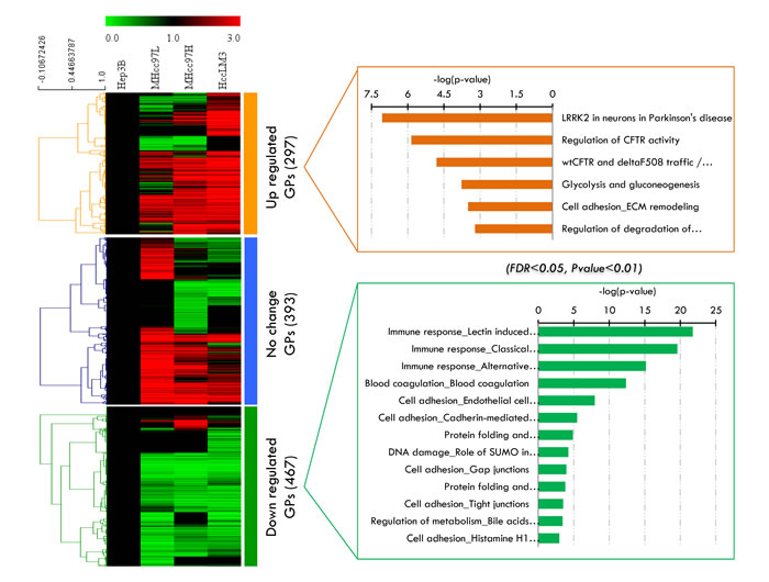 A significant difference (p<0.05) in the 1156 secretome proteins in at least one of the cell lines was taken as an excellent basis for further statistical analysis. We then performed hierarchical clustering based on Pearson correlation of quantitation (Figure 3A) and the k-means values of the proteins per cell lines. Three main clusters can be observed with increased, decreased or unchanged proteins (Supplemental Table S2). In cluster 1, the expression levels of secretome proteins (297 GPs) continuously increased with the metastasis level of the HCC cell lines. Cluster 2 contains one third of the identified secretome proteins with mixed regulation and without any significant changes in abundance among the four HCC cell lines. Cluster 3, which represents nearly 50% of the dataset (467 GPs) was continuously decreased in metastatic cell lines. To investigate this more systematically, we analyzed the hierarchical clusters (cluster 1 and cluster 3) of the 1156 proteins and their quantification information, which we then used as an input to view enrichment pathways by MetaCore (Figure 3B). The high connectivity of the pathways “immune response” (p-value= 2.550E-20 and FDR= 6.376E-18) and “blood coagulation” (p-value= 4.356E-13 and FDR= 5.446E-11) were enriched in cluster 3, whereas cluster 1 exhibited significantly more proteins within the “glycolysis” ( p-value= 1.701E-04 and FDR= 1.205E-02) and “ECM remodeling and cell adhesion” (p-value= 3.156E-04 and 1.957E-02) pathways. The fact that the abundance of latter cluster is lower in the no-metastasis cell lines suggests the positive involvement of these proteins in the release of cells from the surrounding tissue and supports cell metastasis. Meanwhile, the decrease proteins in cluster 3 indicates the reduced expression of such genes in HCC cells with no metastasis ability. From a biomarker perspective, cluster 1 can be used as a positive (increasing) candidate dataset for HCC metastasis development.
