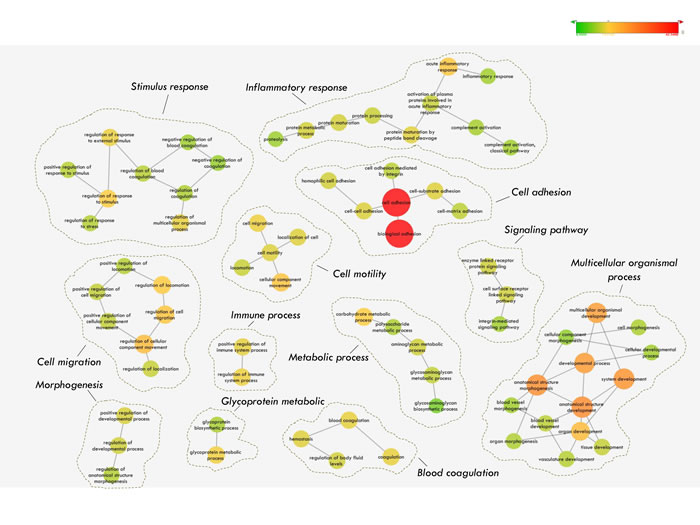 We wished to investigate whether our proposed N-glycosecretome includes key factors or mediators that may activate or inhibit metastasis during HCC development and progression. Therefore, we performed enrichment map profiling in our N-glycosecretome quantification dataset. In this systemic approach, we used Gene Ontology (GO) annotations for biological processes to map our 649 N-glycoproteins (604 GPs) from 1,382 N-glycopeptides (Figure 4). This analysis resulted in the significant (p<0.05) over-representation of 692 GO terms (Supplemental Table S6). Because several annotations are branched together, we visualized the analysis as an enrichment network, which algorithmically clustered GO terms with highly similar content using the enrichment map plug-in in the Cytoscape environment [44, 50-52]. A higher significance level (Benjamini & Hochberg corrected p-value < 1×10-7) was selected for our next analysis. A few of the resulting clusters corresponded to “morphogenesis”, “cell motility” “metabolic process” and “inflammation response”, which are considered traditional marks of cancer development and progression. Meanwhile, a rather impressive observation is the overrepresentation of the “cell adhesion”, “cell migration” and “multicellular organismal process”, whose importance in cell metastasis and progression has been extensively reported [51-54] (Benjamini & Hochberg corrected p-value =4.62×10-44, 3.84×10-13, 1.24×10-13 & 5.82×10-13). Particularly for the above three biological process, well-known hepatocellular carcinoma biomarkers such as alpha fetoprotein (AFP) and Dickkopf-related protein 1 (DKK1) [55] were also identified in the cell adhesion cluster. Finally, several other clusters corresponded to specific biological process, such as “signaling pathway”, “blood coagulation”, “immune response”, “stimulus response” and “glycoprotein metabolism”, the implications of which is also significant in cancer development and progression (Figure 4).