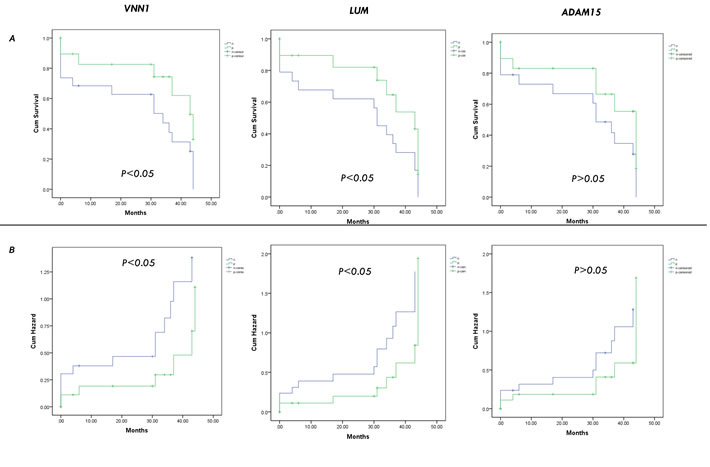 Figure 7: Validation of the candidates by cumulative survival rates analysis. The 10-month, 20-month, and 30-month cumulative survival A. and hazard B. rates of patients with the candidates (FAT1, DKK3, NrCAM, LUM, VNN1, ADAM15).