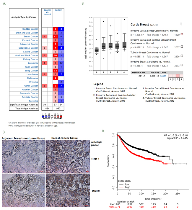 Figure 1: Elevated FADD expression was correlated with human breast cancer progression. A. The gene summary for FADD in cancers was gained from OncomineTM Research Edition. B. Increased FADD mRNA expression was analyzed in Curtis Breast dataset with 2,136 samples. C. FADD expression was determined by immunohistochemical analysis on tissue microarray. Representative images (pathological grades: II and III) were shown: (a) adjacent histologically nontumor tissue, (b) breast tumor tissue. D. Cancer survival analysis of FADD expression was assessed on Kaplan-Meier plotter. Meta-analysis based on biomarker assessment shows that High FADD expression versus low expression has a poor survival in human breast cancer. P-value is calculated using log-rank test.