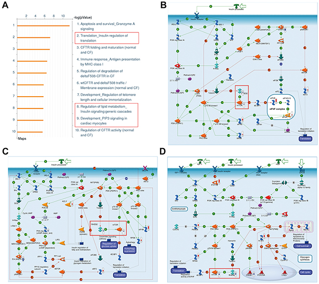 Figure 2: Enrichment analysis of differentially expressed proteins in MCF-7 cells with FADD knockdown. A. Top ten most significant pathways predicted by GeneGo pathway analysis. The results were ordered by -log10 of the p value of the hypergeometric distribution. B–D. Pathways related to Rheb-mTORC1 signaling axis within the top ten most significant pathways. Thermometers with blueorred next to symbols show proteins identified in LC-MS/MS detection: red color represents the proteins that increased in FADD knockdown MCF-7 cells compared to control group; blue color represents the decreased proteins.