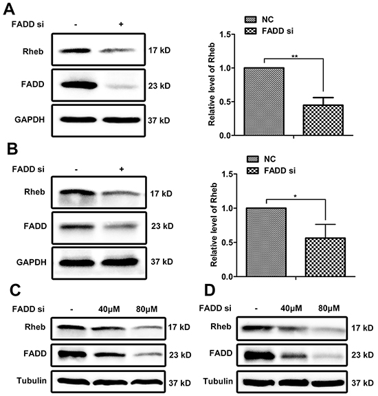 Figure 3: FADD interference downregulated Rheb expression. NC or FADD siRNA was transfected in MCF-7 A. or MDA-MB-231 B. cells for 48 h. Total cell lysates were detected by western blotting with antibodies as indicated. Band intensity was quantified by chemiAnalysi software. Data was represented as mean ± S.D. P values were calculated by Student’s t-test (*p < 0.05; **p < 0.01) and the experiment was repeated at least three times. Different dose of FADD siRNA was transfected into MCF-7 cells C. and MDA-MB-231 cells D. The expression of FADD and Rheb was detected by western blot.