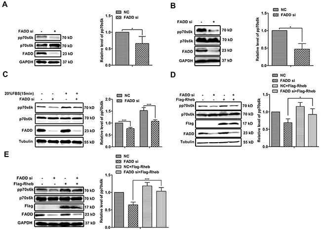 Figure 5: FADD regulated mTORC1 activity through Rheb. MCF-7 A. or MDA-MB-231 B. cells were transfected with FADD siRNA/NC for 48 h. The cell lysates was performed by western blot with indicated antibodies (n=4). C. MCF-7 cells were transfected with FADD siRNA/NC for 24 h and then starved for 24 h. Then cells were stimulated by 20% serum for 15 minutes (n=3). Cells were cotransfected with FADD siRNA/NC with pRK5-Flag-Rheb or control vector for 48 h. Western blot analysis in MCF-7 D. or MDA-MB-231 E. Band intensity was quantified by chemiAnalysi software. Data are represented as mean ± S.D. *p < 0.05; ***p < 0.001. Each bar is the mean of 3 independent experiments.