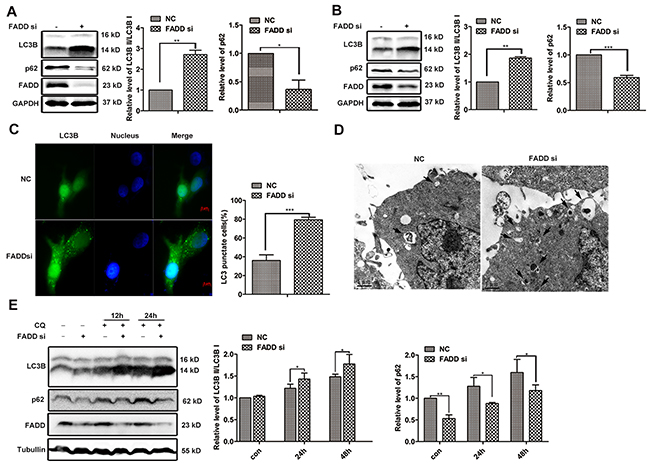 Figure 6: FADD interference induces autophagy. MCF-7 A. or MDA-MB-231 B. cells were transfected with FADD siRNA/NC for 48 h. LC3B and p62 were detected by western blotting. Band intensity was quantified. Each bar is the mean of 4 independent experiments. C. MCF-7 cells were transfected with GFP-LC3 plasmid together with FADD siRNA/NC for 48 h. Formation of vacuoles containing GFP-LC3 (dots) was examined by fluorescence microscopy. Scale bar: 5 μm. D. MCF-7 cells were transfected with FADD siRNA/NC for 48 h and then conducted to transmission electron microscopy (TEM) analysis. Representative image of different experiment was shown. Scale bar: 1 μm. E. MCF-7 cells were transfected with FADD siRNA/NC for 24 h and then treated with 20 μM chloroquine (CQ) at indicated times. Cell lysates were detected by western blotting (n=3). Each bar is the mean of 3 independent experiments. Data are represented as mean ± S.D. *p < 0.05; **p < 0.01; ***p < 0.001.