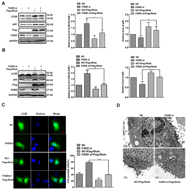 Figure 7: Rheb overexpression rescued autophagy induced by FADD knockdown. MCF-7 A. or MDA-MB-231 B. cells were transfected with FADD siRNA/NC together with pRK5-Flag-Rheb or control plasmid for 48 h and then lysed for western blotting. Band intensity was quantified. Each bar is the mean of 3 independent experiments. C. MCF-7 cells were cotransfected GFP-LC3 with FADD siRNA/NC, pRK5-Flag-Rheb, control vector as indicated. Formation of vacuoles containing GFP-LC3 (dots) was examined by fluorescence microscopy. Scale bar: 5 μm. D. MCF-7 cells were transfected with FADD siRNA/NC together with pRK5-Flag-Rheb/control plasmid for 48 h and then subjected to transmission electron microscopy (TEM) analysis. The representative of three different experiments was shown. Scale bar: 1μm. Data are represented as mean ± S.D. *p < 0.05; ***p < 0.001.