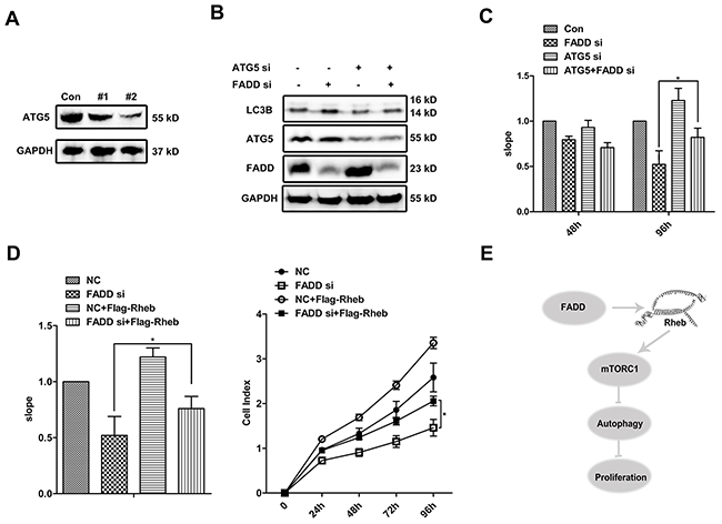Figure 8: FADD enhances cell proliferation by repressing autophagy. A. ATG5 siRNAs/NC was transfected in MCF-7 cells for 48 h. ATG5 expression was detected. B. MCF-7 cells were transfected with ATG5 siRNA/NC together with FADD siRNA/NC for 48 h and detected by western blotting. C. MCF-7 cells were transfected with ATG5 siRNA/NC together with FADD siRNA/NC and then seeded to E-Plate on Real-Time Cell Analysis (RTCA). Each bar is the mean of 4 independent experiments. Data are representedas mean ± S.D.*p < 0.05. D. MCF-7 cells were transfected with FADD siRNA/NC together with pRK5-Flag-Rheb and then performed to RTCA analysis. Each bar is the mean of 4 independent experiments. Data are represented as mean ± S.D.*p < 0.05. E. Proposed model of FADD in autophagy.