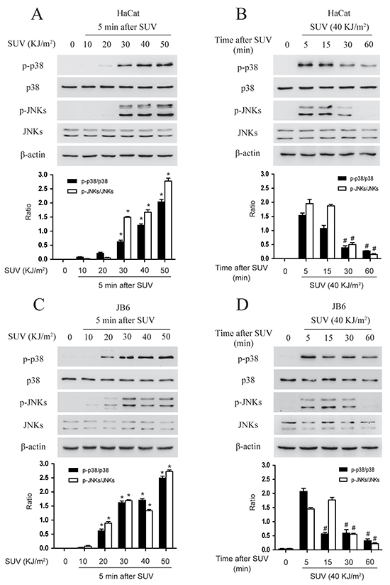 Figure 2: SUV induces the phosphorylation of the p38, JNKs in a dose and time dependent manner in the HaCat and JB6 cells. A. HaCat cells (1×106) were cultured in 10-cm dishes for 24 h, and then incubated with DMEM medium without serum for 12 h and treated with different dose of SUV as indicated. The cells then were replaced an incubator, and were harvested at 5 min after SUV. B. HaCat cells (1×106) were cultured in 10-cm dishes for 24 h, and then incubated with DMEM medium without serum for 12 h and treated with 40KJ/m2 SUV, The cells were replaced in the incubator for different time point after 40KJ/m2 SUV, then were harvested. The cell lysates (30μg) were subjected to 10% SDS-PAGE. Protein bands were detected by Western blot. C. and D. JB6 cells were treated in the same manner with HaCat. Histogram shown are representative of least three independent experiments. The asterisks (*) indicate a significant (P<0.05) difference compared to 0 group. The pound (#) indicate a significant (P<0.05) difference compared to the group of 5 min after SUV exposure.
