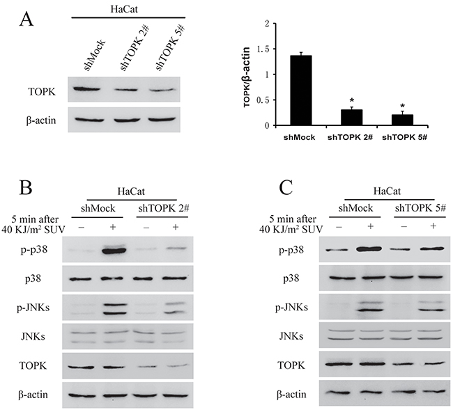 Figure 3: Knock down TOPK inhibits SUV-induced the phosphorylation of p38 and JNKs. A. Efficiency of Knock down TOPK 2# and TOPK 5# in HaCat cells. Histogram shown are representative of least three independent experiments. The asterisks (*) indicate a significant (P<0.05) difference compared to shMock group. B. TOPK 2# inhibited the phosphorylation of p38 and JNKs significantly under the condition of SUV irradiation. HaCat shMock cells and HaCat shTOPK cells were stimulated with SUV light (40 KJ/m2) after 12 h of serum-free starvation. The whole cell lysates were extracted at 5 min after SUV light. The phosphorylation levels of p38, JNKs were detected by Western blot. C. Knock down TOPK 5# inhibited SUV-induced the phosphorylation of p38 and JNKs significantly.