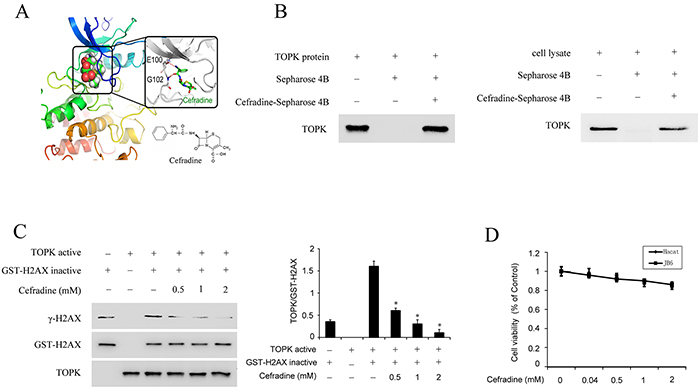Figure 4: Cefradine binds with TOPK and inhibits TOPK activity. A. The docking model of cefradine and chemical structure of cefradine. The docking model was described in ‘Materials and methods’. B. Cefradine binds directly with TOPK ex vivo and in vitro. Cefradine-Sepharose 4B or Sepharose 4B were used for binding and pull-down assay. C. Cefradine inhibits TOPK activity in vitro in a dose dependent manner. An inactive GST-H2AX protein was used as the substrate with active TOPK and 100 μM ATP. Protein were resolved by 10% SDS-PAGE gel and detected by Western blot. Histogram shown are representative of least three independent experiments. The asterisks (*) indicate a significant (P<0.05) difference compared to TOPK kinase and H2AX substrate group (lane 3). D. Cefradine have no effects on the cell viability of HaCat and JB6 cells. HaCat cells and JB6 cells were treated with 0.04, 0.5, 1 and 2 mM of Cefradine for 24 h, and measured using an MTS according to the manufacturer’s instructions. Cells viability was measured and expressed as mean ± SEM at least three independent experiments.
