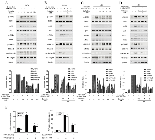 Figure 5: Cefradine down-regulates SUV-induced downstream TOPK signaling pathway in a dose and time dependent manner and inhibits the secretion of cytokines in the HaCat and JB6 cells. A. HaCat cells (1×106) were cultured in 10-cm dishes for 24 h, and then incubated with DMEM medium without serum for 12 h. Next, the cells were treated at 2, 4, 6, 12 h with 1 mM cefradine, then replaced in a incubator for 5 min after treated with 40KJ/m2 SUV. The cell lysates (30 μg) were subjected to 10% SDS-PAGE gel. Protein bands were detected by Western blot. B. HaCat cells (1×106) were cultured in a 10-cm dishes for 24 h, and then incubated with DMEM medium without serum for 12 h and then treated for 6 h with 0.5, 1, 2 mM Cefradine. Then cells were replaced in incubator for 5 min after treated with 40KJ/m2 SUV. C. and D. JB6 were treated under the same conditions as for HaCat cells were. Histogram shown are representative of least three independent experiments. The asterisks (*) indicate a significant (P<0.05) difference compared to SUV alone group (lane 2). E. HaCat and JB6 cells were pre-treated for 6 h by 2 mM cefradine and stimulated with 40KJ/m2 SUV after 24 h of starvation, and the culture media was collected at 24 h. The concentrations of IL6 and TNF-α were determined using ELISA kits. The values shown are mean SEM of data from three independent experiments. The asterisks (*) indicate a significant (P<0.05) difference compared to control group. The pound (#) indicate a significant (P<0.05) difference compared to SUV group.