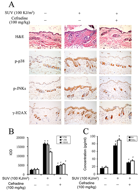 Figure 7: Cefradine inhibits inflammation induced by SUV irradiation in mouse skin. A. Cefradine suppressed SUV-induced epidermis thicker and the proliferation of immunocytes. Adult Babl/c mice were irradiated with 100KJ/m2 SUV irradiation after cefradine smeared the dorsal skin for 3 h, and the skin were harvested at 24 h after irradiation and stained with H&E and IHC. B. Quantification of expression of phospho-p38, phospho-JNKs, and phospho-H2AX in mouse skin tissues were detected by the Image-Pro Plus software and data are shown as integrated optical density units. The values shown are the mean SEM of data from three independent experiments. C. Cefradine inhibited the secretion of IL6 and TNF-α induced by 100KJ/m2 SUV in mouse skin tissues. The concentration of IL6 and TNF-α were determined using ELISA kits. Significant differences were determined by one-way analysis of variance. The asterisks (*) indicate a significant (P<0.01) difference compared to control group. The pound (#) indicate a significant (P<0.05) difference compared to SUV group.