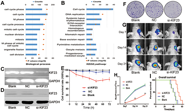 Figure 4: KIF23 is a tumor oncogene in glioma. A&B. Biological processes and KEGG pathway analysis of KIF23 positively correlated genes in glioma, respectively. The upper X-axis indicates gene counts, and the lower X-axis indicates the adjusted (-log 10) p values. C&D. KIF23 mRNA and protein are down-regulated by KIF23 small interfering lentivirus (si-KIF23) in U87cells, respectively. E. MTT assay shows that U87 cell growth is significantly inhibited by si-KIF23. F. Clonogenic assay indicates that si-KIF23 can suppress U87MG cell clone formation. G. Representative images of intracranial glioma mice on days 7, 14 and 21. H. Plot of the Fluc activity by bioluminescence imaging for intracranial tumors. I. Reduction of KIF23 expression prolongs intracranial glioma mice’s overall survival days. NC means negative control group, si-KIF23 means KIF23 small interfering lentivirus treatment group.
